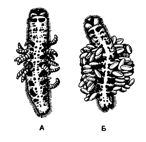 Самки такого наездника разыскивают самых маленьких гусеничек капустницы и, вонзая в их тело свой острый яйцеклад, откладывают туда порцию микроскопически мелких яичек — штук 15–20 (рис. 213). Из яичек выходят личинки, которые питаются жиром и кровью гусеницы, продолжающей кормиться и расти, и только для окукливания вылезают наружу; гусеница при этом погибает (рис. 214).