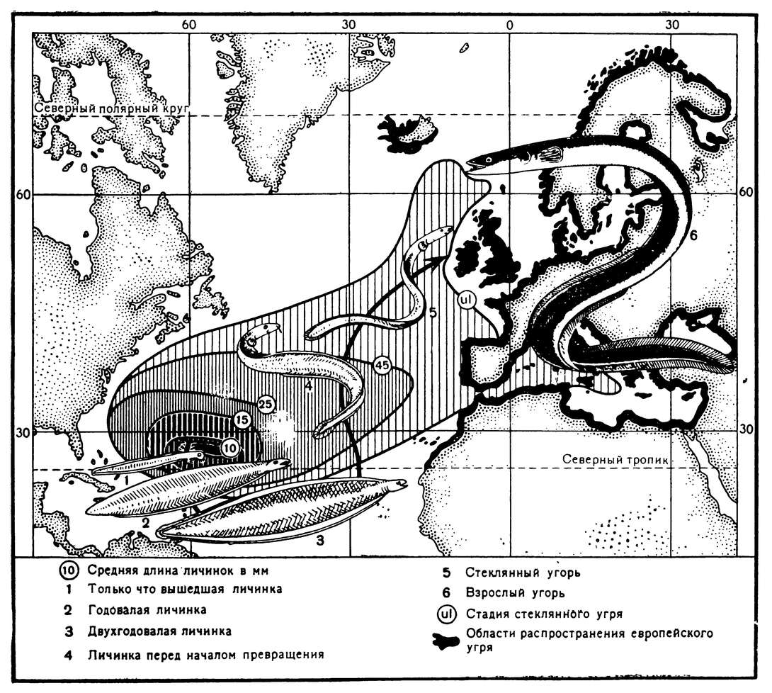 Оказалось, что готовые к размножению угри, прожившие в реках около десятка лет, уходят в Атлантический океан и назад уже не возвращаются. В океане они совершают дальний путь до Саргассова моря и там на больших глубинах мечут икру. Вышедшие из икринок личинки (рис. 64) около трёх лет живут в открытом океане и пассивно, увлекаемые Гольфстримом, дрейфуют к берегам Европы (рис. 65). Эти листовидные и прозрачные личинки, совершенно непохожие на угрей, были известны зоологам ещё в прошлом столетии, но описывались в качестве представителей особого рода лептоцефалов (тонкоголовок).