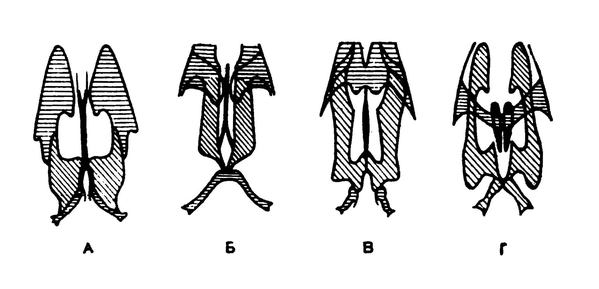 А — дромеогнатический (нанду): Б — схзиогнатическнй (журавль); В — десмогнатнческий (утка); Г — эгитогнатический (ворона).